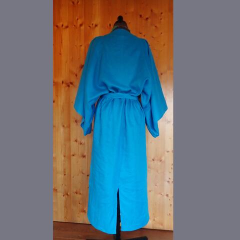 This custom-made dress, made from 100% linen, comes with large kimono-style sleeves. The vibrant turquoise colour ads sparkle to your appearance on any summer day.
