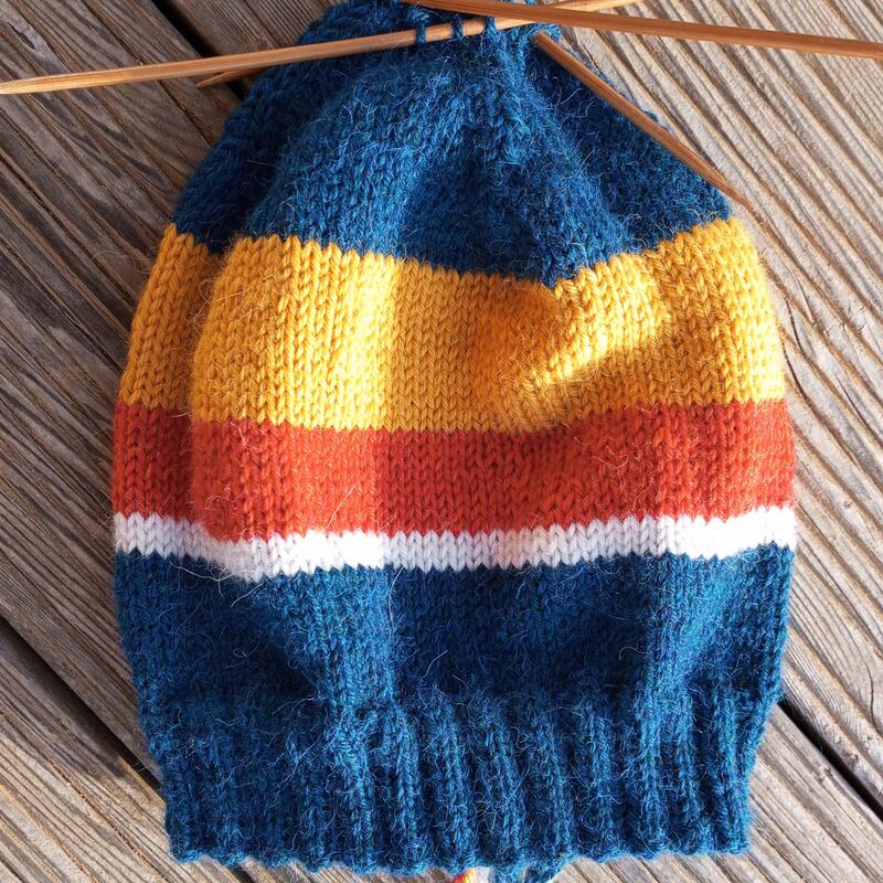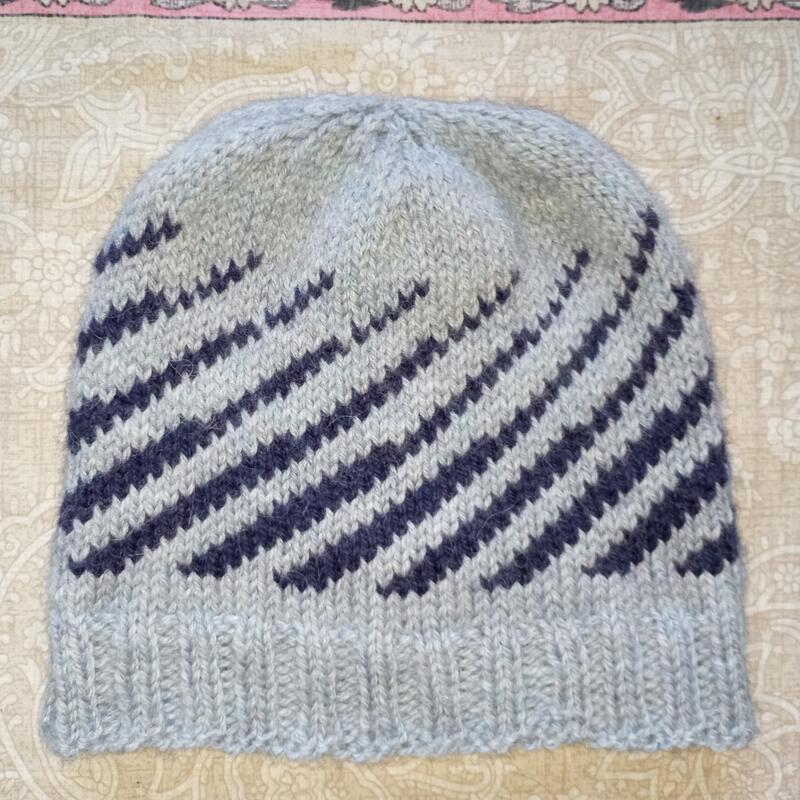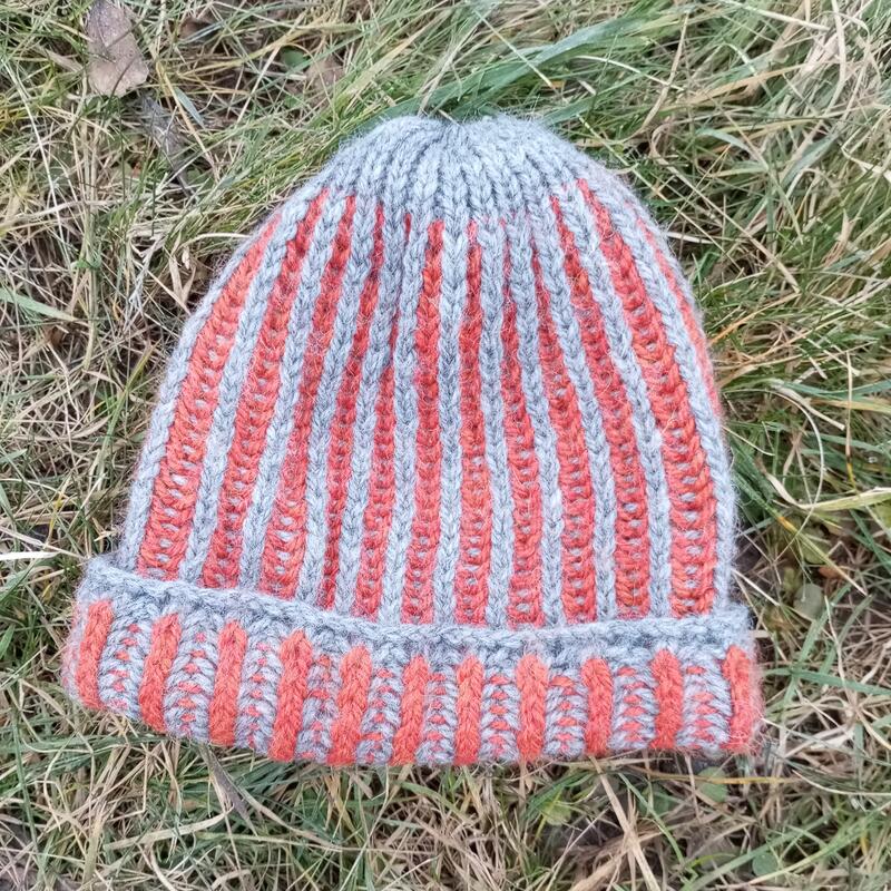 A diagonal pattern gives it that fun look. And check out those stripy beanies! Any colour combination is possible.