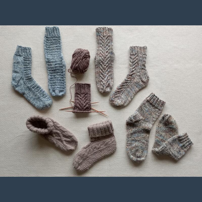 Some designs featured are from DropsDesign and only sold as a single item or per order. The light-blue socks in the collage are not for sale and only displayed for reference